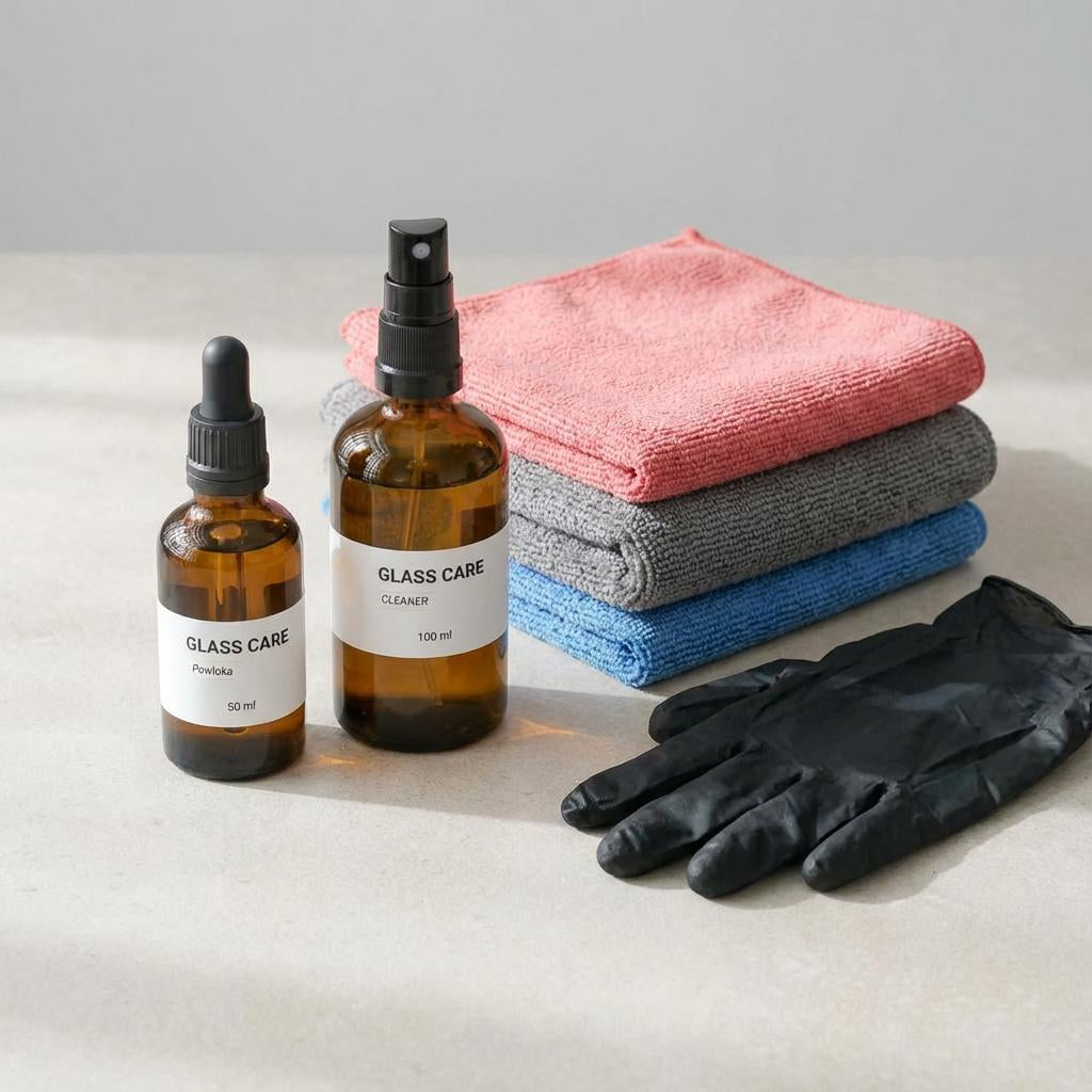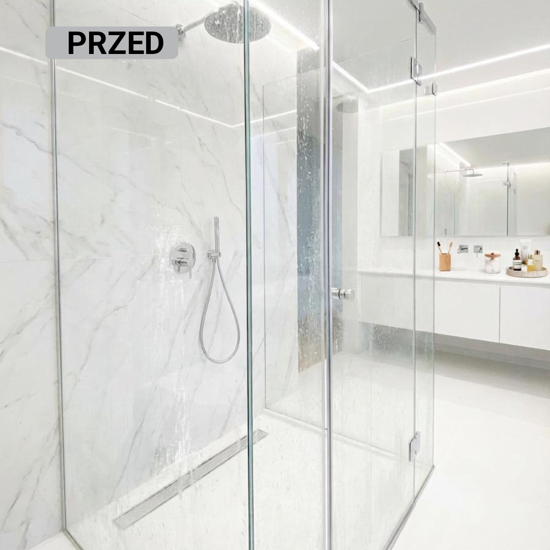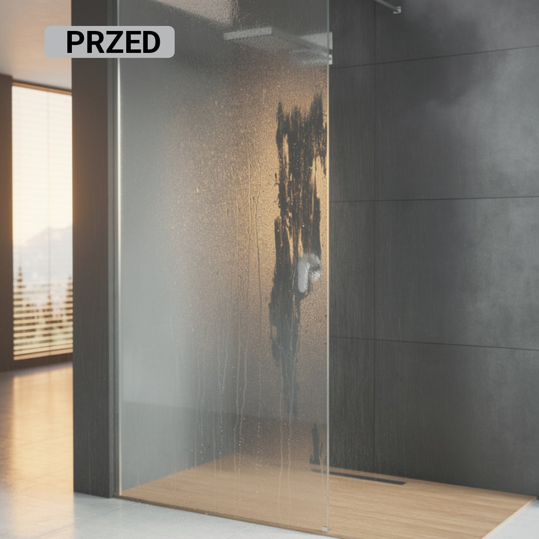 To zależy od warunków użytkowania. Przy bardzo twardej wodzie efekt stopniowo słabnie, ale szyba nadal pozostaje bez zacieków i zachowuje połysk. Przy mniej twardej wodzie i używaniu ściągaczki ochrona może utrzymywać się nawet miesiącami.