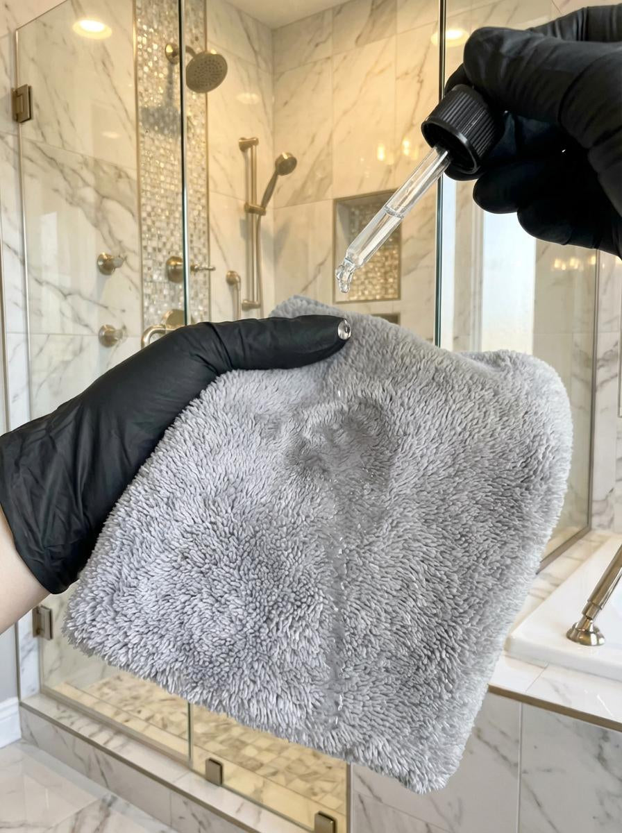 Nałóż kilka kropel Kamień Bloker pipetą na mikrofibrę z grubym włosiem i rozprowadź cienką warstwą bez smug po całej szybie.